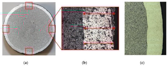 The measuring and analysis were performed with the use of a microscope equipped with a camera. The microscope was used to take four pictures of the coating after CWR around the diameter of the probes (Figure 12b). Afterwards the thickness was measured with the image processing software ImageJ. This was realized with a reference picture of 1 mm scale that was taken with the exact same microscope settings as the rest of the pictures. The software was used to measure the pixel/mm in the reference picture. Afterwards, three measurements were taken for every picture of the coatings (Figure 12, red arrows). For every workpiece, four pictures were taken (Figure 12, red squares) and the mean value for all twelve measurements were calculated. To simplify the measuring, for every analyzed workpiece a slice of the formed area was cut out. Since the simulations showed that the thickness of the cladding is uniform along the width of the formed area, it was assumed that this also applies to the experimental trials and that it is therefore acceptable to make the cut outside of the lateral middle of the workpiece. Due to the used materials the coating is clearly visible after sandblasting even without etching the grinded surface (Figure 12a). The material is free of pores (Figure 12c). It is very homogenous in the base material and shows no heat affected zone due to the heating and rolling in the CWR-process. This is one of the main advantages of a process chain which has the welding process take place before the forging process.