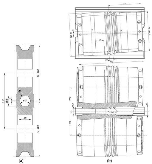 Design and configuration, with the dimension in mm: (a) grooved rolls for longitudinal rolling of a preform; (b) rolls with helical ribs for skew rolling of rods.