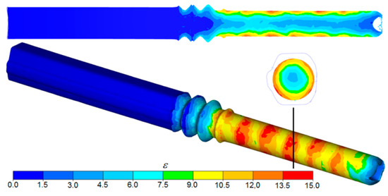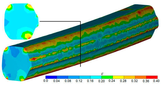 Interesting data come from the FEM simulation of the second stage of the process (rolling in helical passes). The helical ribs on the surfaces of the two rolls cut into the material to a depth corresponding to the adopted deformation, setting the workpiece in rotational motion and forming annular grooves on the circumference of the preform. The workpiece with the irregular outline was closed between cooperating grooves and was gradually deformed and elongated in the helical pass (with a decreasing depth) until it formed into a rod. The final shape of the rods was obtained as the cross-section of the workpiece was sized by the cylindrical surfaces of the tools located directly behind the helical pass. The kinematics of the process had a direct impact on the nature of strains in the material (Figure 8). As a result of the rotational compression of the material by the helical ribs on the rolls, strains concentrated in the surface layers of the rolled rod and then gradually decreased in the radial direction towards the rod axis. There were also visible ring-shaped strain concentration areas on the surface of the rod. The increase in strain was caused by the cyclic penetration of the helical collars into the material, during which annular grooves formed on the preform. In contrast, areas located between adjacent grooves were only deformed in the final coils of the pass, as a result of which strain in these zones had values that were several times lower. The differences in strain in the surface layers of the workpiece were also increased by friction forces, which caused circumferential displacement of the material and, thus, generated additional strain in the tangential direction.
