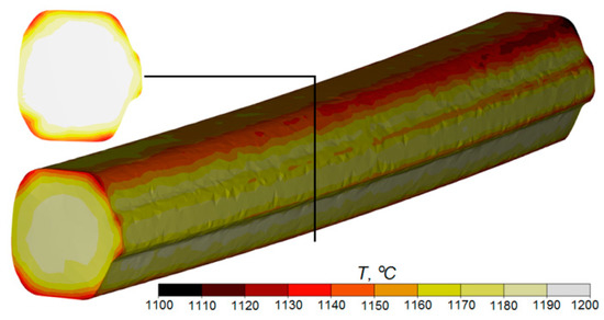 During the numerical simulations, changes in the temperature of the workpiece were also analyzed, as shown in Figure 9. Temperature is a very important parameter of the process. It significantly affects plastic deformation resistance, effective strain, and the quality of the products obtained. A characteristic feature of the temperature distributions determined by FEM is their unevenness. While the temperature of the surface layers (in the range 100–150 °C) decreased, the central zone of the workpiece retained a high temperature (similar to the initial one). Obviously, the drops in the temperature of the outer layers of the material were caused by the dissipation of heat to the cooler tools and the surrounding environment. However, part of the heat loss was compensated for by the heat generated as a result of the conversion of plastic work and friction work into heat. As a result, the temperature of the rod after the second rolling stage was in the range of 1050–1100 °C (despite the relatively long duration of the process). This enables transition into the next stage of recycling of scrap rail heads (e.g., rolling of balls or other axisymmetrical forgings in a cross-wedge or a skew rolling mill) without the need to reheat the material.