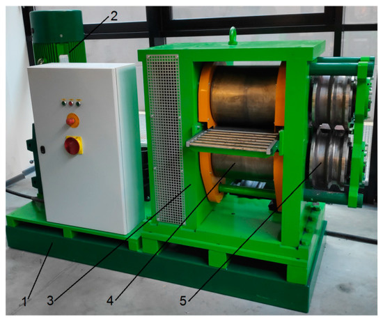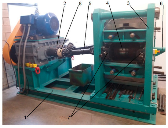 Preform rolling tests were carried out in a longitudinal rolling mill [30]. Rods, on the other hand, were rolled in a skew rolling mill [31]. Both rolling mills had been designed at the Lublin University of Technology and are currently installed at the Center of Innovative Technologies of the Lublin University of Technology. The longitudinal rolling mill used in the tests was a frame–console mill (Figure 11). The structure of the mill allows it to be used for longitudinal rolling of sheets, strips, foils and flat bars, which are produced using plain roll barrels (frame configuration). The console configuration can be used for metallurgical groove rolling and forge rolling on periodically changing segments. The basic assembly of this mill included a frame, an electric engine with a helical-bevel gear motor, and a rolling cage with an eccentric roll-axis-spacing adjustment system for each roll. In addition, the rolling mill was equipped with a system for recording torque during the rolling process. Preform rolling tests were performed using grooved rolls positioned in the console configuration. Tests of the second stage of rolling were performed using a skew rolling mill with a segmented design (Figure 12). The machine consisted of a support frame, a drive system, a rolling cage, and a drive train. The rolling mill was also equipped with sensors for measuring the torque and thrust force of the tools; these devices cooperate with the machine's control system and protect the drive system and the tools against overload and damage. The basic technological parameters of both rolling mills are given in Table 2.