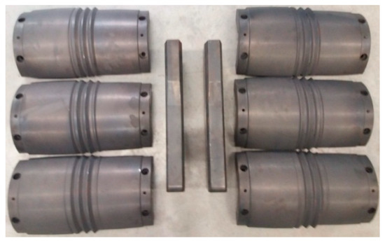 For the purposes of the experiments, the grooved rolls forming a hexagonal pass were mounted on the console shafts of the longitudinal rolling mill. Each roll consisted of two segments, which were mounted on the perimeter of the outstretching shafts using two lock nuts. The rolls with the helical ribs were mounted on the working shafts of the skew rolling mill (Figure 13). Each tool set consisted of three individual segments, mounted every 120° on the perimeter of the shafts. In addition, two (upper and lower) guides were installed between the rollers to hold the rolled material in the tool workspace. The set of tools consisting of two segmented rolls and two guides used in the tests of the second stage of the rolling process is shown in Figure 13. The geometric parameters of the tools and their positions were consistent with the specifications given in Figure 2.