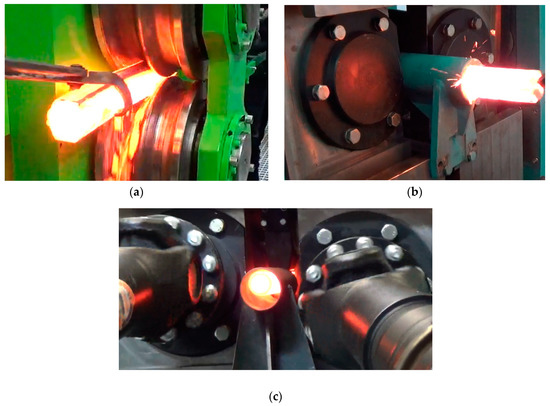Before processing, blanks (350 mm long rail head sections cut off from worn railway rails) had been heated in an electric chamber furnace to a forming temperature of 1180 °C and were then rolled longitudinally in the hexagonal pass (Figure 14a). Next, the rolled preforms were transferred to the skew rolling mill and fed into its workspace (Figure 14b). During rolling, the billet was gripped by the wedge collars of the rotating rolls, which set it in a rotary motion and pulled it into the helical passes formed by the cooperating grooves and collars of the two rolls. As the working collars of the rolls pressed against the preform, its irregular cross-section gradually changed into a circular cross section, and a rod was formed. The rods were automatically removed from the working space of the skew rolling mill through the discharge sleeve (Figure 14c) located behind the rolling cage.