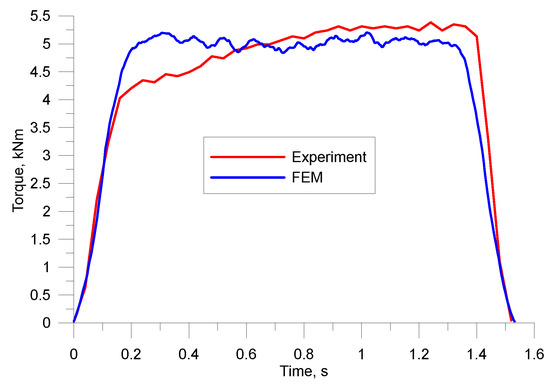 During the tests, force parameters of the process were also registered. More precisely, torques were recorded for longitudinal rolling and radial forces, and rolling torques were registered for skew rolling. Torque curves for longitudinal rolling in the hexagonal pass are shown in Figure 18. The figure shows that the quantitative agreement between the experimental and numerical results was quite good. The maximum torques in both cases slightly exceeded 5 kNm. However, there was a visible difference in the shapes of the two functions. In the case of the numerical model, the torque remained constant at all times, but during the experiment it gradually increased. The difference may be caused by the drop in the temperature of the material during the experiment, which affects the value of plastic deformation resistance.