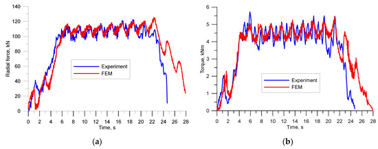 Distribution of force parameters during rolling of rods in the skew rolling mill: (a) radial force; (b) torque.