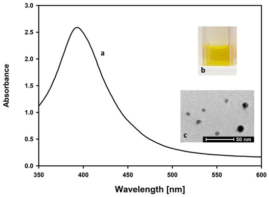 Silver nanoparticles prepared by a chemical reduction of silver nitrate (V) using sodium borohydride: (a) characteristic UV-Vis spectrum, with the maximum absorbance at 395 nm, (b) color of the solution, (c) transmission electron microscope image of the synthesized AgNPs.