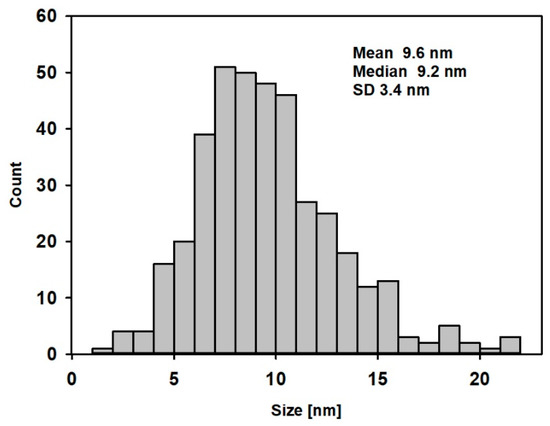 The data were confirmed by direct determination of AgNPs’ diameter, obtained from TEM images. The mean TEM-based diameter of AgNPs was 9.62 nm (median 9.2 nm, SD 3.4 nm). Figure 3 shows the TEM particle size distribution of AgNPs.