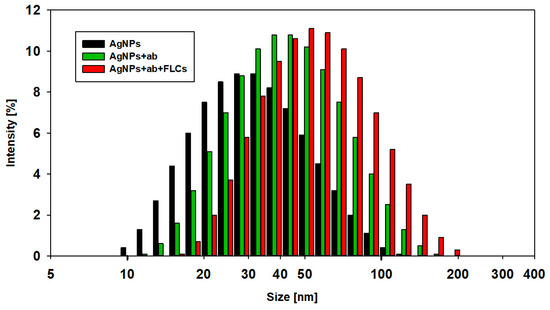 Dynamic light scattering size distribution (by intensity) curves for AgNPs (black), AgNPs + ab (green), and AgNPs + ab + FLCs (red) solutions.