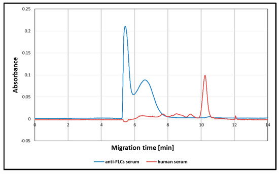 Capillary electropherogram of the anti-FLCs serum (blue line) and human serum, as a reference (red line).