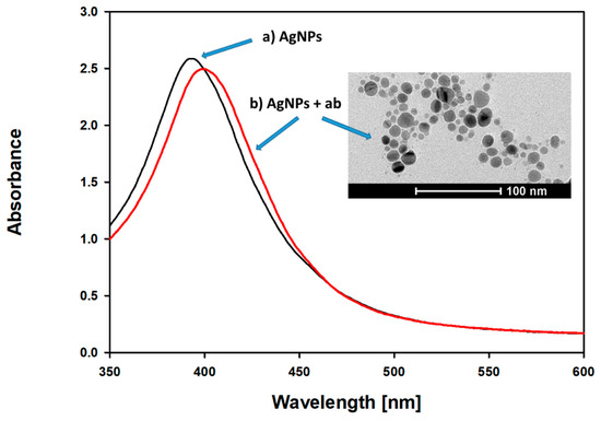 To characterize the antibody functionalization process, UV-Vis LSPR spectra were recorded. Compared to citrate-stabilized AgNPs, antibody functionalization results in a slight red shift and a decrease in the absorption maximum, without peak broadening, which is in agreement with previous studies [22] (Figure 6). The LSPR spectrum right shift indicates the formation of a protein corona.