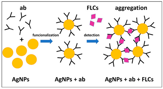 The detection of FLCs in the probe is based on the interaction between specific antibody-functionalized AgNPs and neoplastic cell-derived protein antigens (FLCs) (Figure 7).