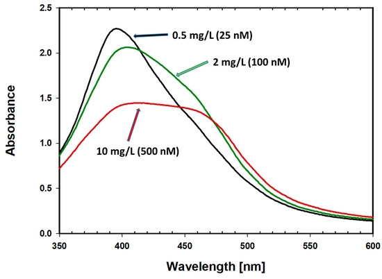 Metal nanoparticles (MNPs) are widely used in many fields of medicine, such as diagnostics, therapy, and medical imaging. Silver and gold nanoparticles have attracted a lot of attention due to their unique optical properties, resulting from localized surface plasmon resonance (LSPR) [7,8]. LSRP depends on several factors, such as the size and shape of particles and the distance between them. When the distance between nanoparticles decreases, or there are changes in the dielectric constant of the local environment on the surfaces of MNPs (changes in the nanoparticle environment or particle agglomeration), a change in the absorbance spectrum occurs, which is accompanied by a change in the colloid color [9].