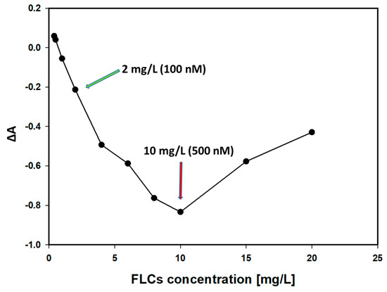 The largest spectral changes occurred at FLCs concentrations of up to 10 mg/L. At higher concentrations (above 20 mg/L), the reaction was blocked, most likely by a protein corona that forms as a consequence of excess protein (antigen).