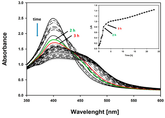The biggest changes in the LSPR spectra occur within the first 2 h (Figure 11 inset). The immunochemical reaction was divided into two phases. During the first 2 h, a decrease in the maximum absorption at 395 nm was observed. Then, in the second phase, the LSPR absorbance peak broadens, and a red-shift and second peak at a wavelength of around 470 nm appears (Figure 11) [26].