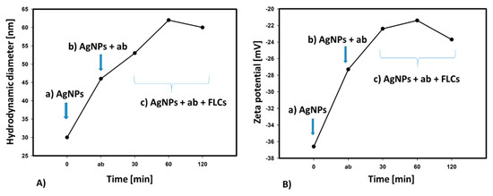 Changes in the hydrodynamic diameter (A) and zeta potential (B) of (a) the citrate-stabilized AgNPs (AgNPs), (b) antibody-functionalized AgNPs (AgNPs + ab) and (c) silver nanoparticles coated with antibodies, after the addition of FLCs (AgNPs + ab + FLCs).