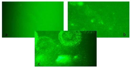 Scattering patterns of monochromatic green semiconductor laser light, passing through: (a) citrate-stabilized silver nanoparticles (AgNPs), (b) antibody-functionalized silver nanoparticles (AgNPs + ab), and (c) nanoparticle aggregates (AgNPs + ab + FLCs).