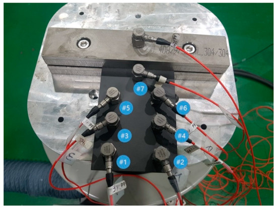 During the vibration excitation test under the above conditions, the input excitation data was collected from a load sensor attached beneath the excited jig. The response accelerations were collected at different locations from the acceleration sensors attached to the CFRP specimens. The input load data and response data of the acceleration sensor were all converted to the frequency domain, and were then converted in the frequency domain to obtain the frequency response function. The measurement sensors are shown in Figure 2. Because the acceleration values differ by location, the acceleration was measured and data was acquired from sensors at diverse locations.