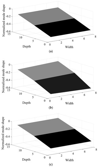Normalized mode shape of first mode. (a) Specimen #1, (b) Specimen #2, (c) Specimen #3.