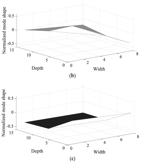 Normalized mode shape of second mode. (a) Specimen #1, (b) Specimen #2, (c) Specimen #3.