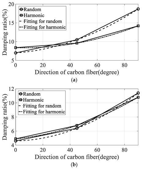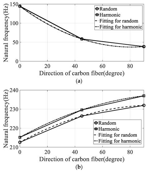 The variations in modal parameters, resonance frequency, and damping coefficient according to the direction of the carbon fiber are plotted in Figure 9 and Figure 10. The curve-fitted second-order polynomial lines were also plotted to calculate the partial derivative for each direction of the carbon fiber. The constants of the curved-fitted line and the partial derivative values according to the direction of the carbon fiber are summarized in Table 4.