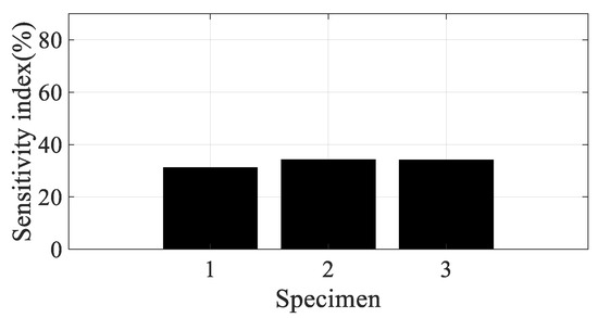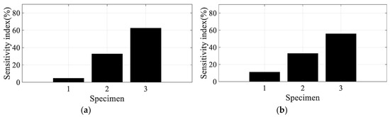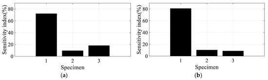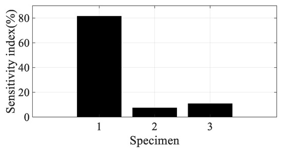 The derivatives in Equations (9) and (10) have the frequency response function itself, and the magnitude of each derivative could be directly related to the sensitivity result [22,23,24,25,26,27,28]. Hence, for the sensitivity index for each parameter of interest in the i-th mode, specimen #k is formulated as the magnitude of the partial derivative after dividing it by the magnitude of the frequency response function, as shown in Equations (11) and (12), respectively.