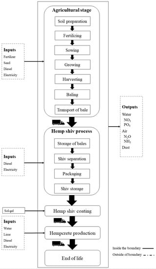 Previous LCAs has been conducted on a wide range of bio-based materials, including hemp-concrete (hempcrete) [,,], fibre composites [], starch-based polymers [] and bio-based plastics []; however, regionalised LCA of bio-based materials has received less attention.