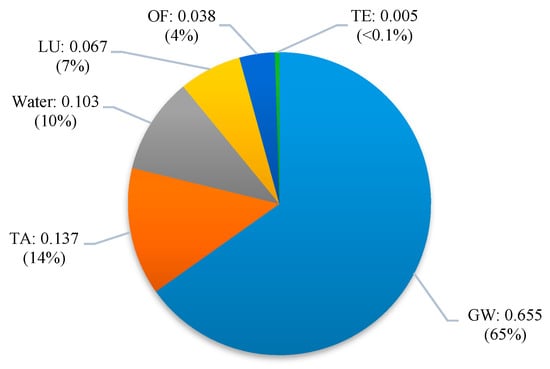 The total damage to the ecosystem from production of 1 kg of sol-gel coating based on the hierarchist perspectives was 1.01 PDF m2 y/kg, followed by 0.39 and 5.458 PDF m2 y/kg for the individualist, and egalitarian perspectives. Global warming had the highest contribution to the terrestrial biodiversity damage among other environmental impacts. Terrestrial acidification contributed 38% of damage to terrestrial ecosystem based on individualist perspective, followed by global warming 35% (Supplementary Materials, Table S7). Using the hierarchist perspective, global warming was the main contributor (65%), followed by terrestrial acidification 14%. Regarding the egalitarian perspective, global warming was the main contributor at 94%, followed by terrestrial acidification, with only 2%. There are few studies on LCA of sol-gel coatings in the literature, and because of confidentiality issues relating to the chemicals used, their inventory and impact assessment results have not been reported [].