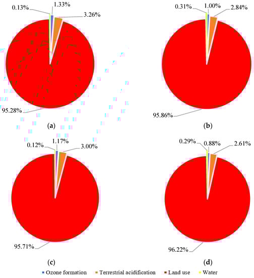 The difference between Figure 4a,c, which comes from using different allocation methods, is largely because the environmental damage associated with mass allocation is greater than those analysed based on economic allocation. This difference has been shown between Figure 4b,d for generic results as well. Since regionalised characterisation factors for three perspectives are same, the comparison of the results is shown based on one perspective (hierarchist). Regardless of generic impact categories, land use is the main driver for both allocation methods (mass and economic). The damage to terrestrial biodiversity based on regionalised characterisation factors shows greater values than generic ones. The main differences come from the impact of land use. Looking inside the site-specific characterisation factors of land use [] shows that the median regionalised characterisation factor for land occupation of annual crop (e.g., hemp) is 0.76 biodiversity damage potential (BDP), while the generic value (world average) is 0.60 BDP. Regionalised characterisation factors of land use have been selected based on the world wildlife (WWF) ecoregion map []. Based on the geographical location of the studied farms, WWF biome 4 (temperate broadleaf forest) was chosen and its corresponding characterisation factors were applied. Land use change is a combination of three land use impacts: land transformation, land occupation and permanent impact of land use. Since there was no reliable data for site-specific characterisation factors of land transformation and permanent impacts, these two impacts were calculated based on generic values. Terrestrial acidification was the second major contributor among other impact categories (2.61–3.26%). The contribution and difference of the other two impact categories (i.e., ozone formation and water use) were slightly visible because of the large contribution of land use. Comparison of the results of terrestrial acidification based on site-specific and generic data shows that using regionalised characterisation factors increase the terrestrial biodiversity damage by 60%. This difference is 62% for land use. As the results of the comparison show, the use of generic values has a relatively high difference compared with regionalised ones; however, the site-specific characterisation factors were applied from different literature. It is suggested to include site-specific characterisation factors in LCIA methods and in the case of access to regionalized characterization factors, these values are used for analysis.