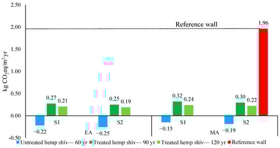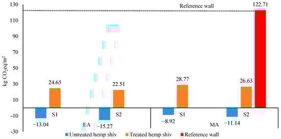 Carbon footprint of 1 m2 hempcrete wall compared to reference wall. EA and MA show the results based on economic and mass allocation. S1 and S2 are waste scenarios (S1—composting hemp shiv and landfilling the rest, S2—landfilling all the materials).