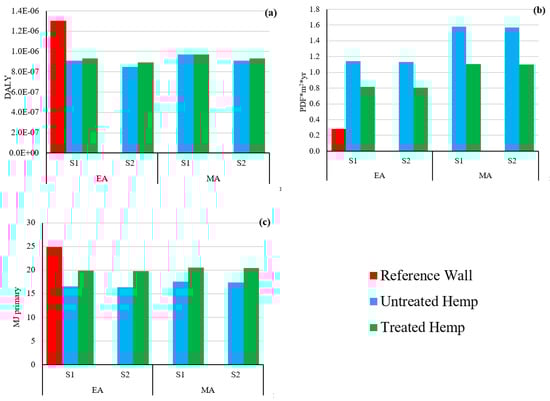 Endpoint environmental impacts of 1 m2 hempcrete wall compared to cavity wall. (a) Human health, (b) ecosystem quality, (c) resources. EA and MA show the results based on economic and mass allocation, respectively. S1 and S2 are waste scenarios (S1—composting hemp shiv and landfilling the rest, S2—landfilling all the materials).