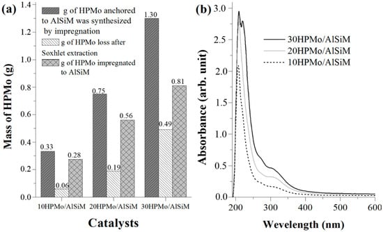 51]. Thus, the measurement of HPMo in the washing solvent in the Soxhlet extractor also made it possible to indirectly estimate the amount of HPMo immobilized efficiently by ultraviolet-visible (UV-vis) spectroscopy [