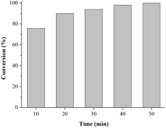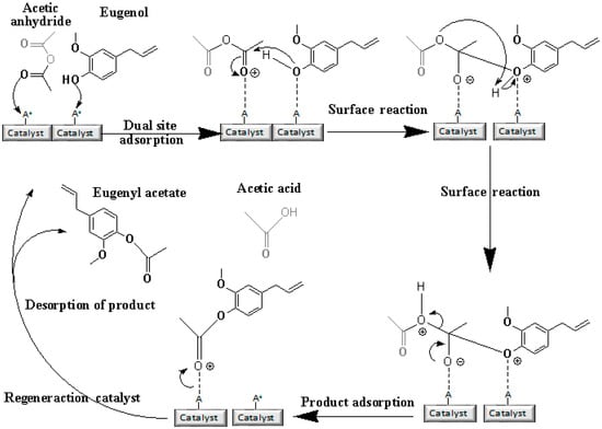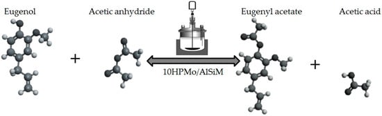 Prior to the experiments, the catalysts were activated at 130 °C for 2 h. Tests of the catalysts were conducted in one run on a multirreator PARR 4871 (Parr Instrument Company, Moline, IL, USA). In a typical experiment, the eugenol was mixed with acetic anhydride at the molar ratio of 1:5 (Eugenol: AA) and 2%