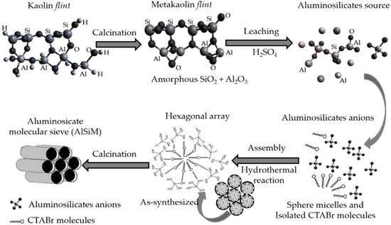 27] where 3 g of the MFL was added in a solution composed of 1.8168 g of CTABr, 0.6172 g of NaOH and 134.7 mL of distilled water which was stirred for 24 h. After this period the solution was hydrothermally treated in a stainless steel autoclave-coated teflon vessel at 110 °C for 24 h. The formed hydrogel was filtered and washed with distilled water and dried at 110 °C for 12 h and calcined at 540 °C for 5 h for removal of the surfactant (CTABr). Based on the procedures described above, it was proposed a possible process for the preparation of ordered mesoporous AlSiM material from natural kaolin