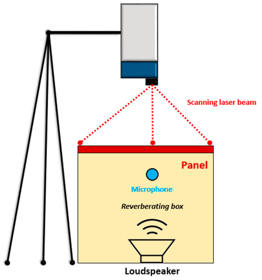 The main purpose of the vibrometry test was to estimate the operative deflection shapes (ODS) that under the white noise excitation condition traduced into the determination of modal frequencies and relative damping coefficients. The test facility consisted of a reverberation box in which a speaker served as an acoustic loading element of the panel, which was simply-supported on the four edges of the box (Figure 5). These edges were bonded on soft material sheets (i.e., polystyrene) in order to avoid any coupling mechanism among the plunge rigid motion and the interested elastic mode shapes, and at once avoiding acoustic energy losses. The presence of a microphone positioned in proximity to the sample served to measure the sound pressure level (SPL) of the incident sound waves. Next, to the outlet surface, a scanning laser head (Polytec PSV 400) was positioned to measure the vibration velocity of the test article. The whole measurement chain was characterized by a class 1 level.