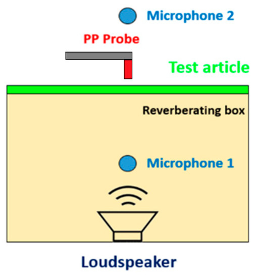 Sound reduction index (SRI) or sound transmission loss (STL) is the most usual product-related acoustical quantity determined in laboratory or field conditions. The sound insulation performance in terms of sound transmission loss (STL) was assessed according to the ISO 15186 standard, because of the dimension of the test article. Figure 6 shows a schematization of the experimental layout. In this case, a broadband sound source was always placed in a reverberating box and the panel positioned as in the laser scanning test. Taking into account the general expression for STL (Equation (4)) and according to the reference standard, the STL was measured as a difference of the incident sound field (because incident SPL in a reverberating environment is directly related to the incident sound power) and the transmitted sound intensity (because also the spatial integration of sound intensity is directly correlated to the transmitted sound power).