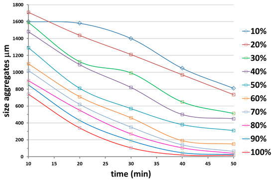 The effect of the ultrasound intensity at the constant pulse of 75% on the size aggregation is shown in Figure 7. The size of the aggregates was monitored in the time when ultrasounds were applied at different intensities ranging from 10% to 100%. It is evident that the minimum particle size was obtained using the maximum intensity of 100%.