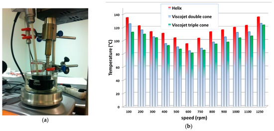 (a) Ultrasound-assisted with high-speed mechanical agitation set up; (b) effect of the applied agitation speed of three different probes on the temperature: (1) helix, (2) viscoject double cone, (3) viscoject triple cone.
