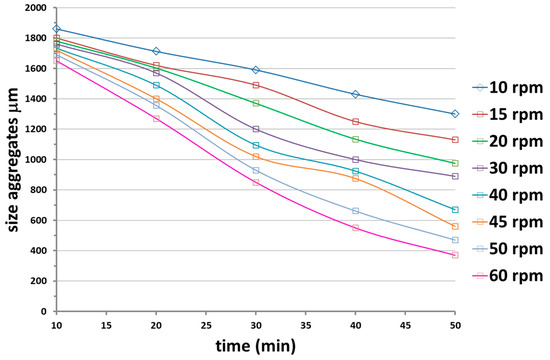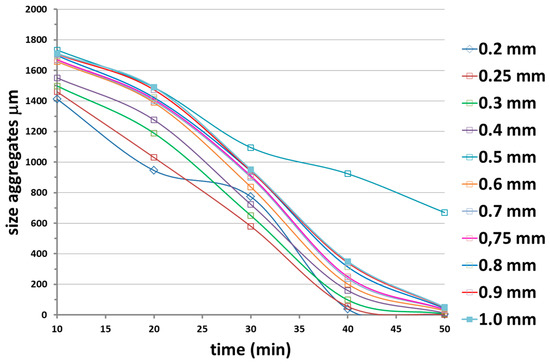Evolution of the size aggregates with the time of application at different distances between the rollers.
