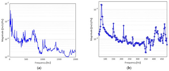 Laser vibrometry results, Frequency Response Functions (FRF) between surface vibration and acoustic pressure: (a) broad-spectrum analysis; (b) spectral windowing of modal region.
