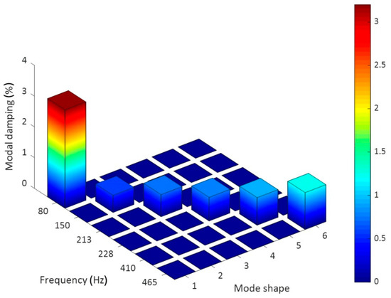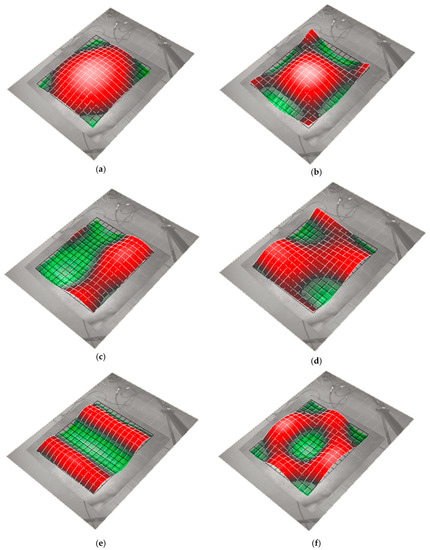 The laser tests carried out on the examined sample brought about a series of important results regarding the modal-vibrational behavior, with respect to acoustic excitation in the frequency range between 0 and 2000 Hz. These results were then implemented and post-processed in a Matlab® environment: the frequency response (vibration velocity/input pressure level), shown in Figure 15, presented a series of peaks, which represented a measure of the modal vibrations. Specifically, the peaks could be associated with defined resonance frequencies, typical of the panel modes, and depending on these peaks, it was possible to extract the specimen’s damping coefficient for that specific mode. In such a way, it was possible to quantify an important acoustic property of the analyzed material: the ability to limit its deformations under the action of a relevant pressure load. Excluding the initial zone with the maximum peaks, several resonances were present in the spectral range between 80 and 480 Hz (Figure 15b). The presence of such maximums allowed us to observe how the most intense modes were recorded for relatively low frequencies, compared to the much higher range of pure acoustic application. Each natural frequency corresponded to a proper vibrating mode shape: in Figure 16, six different elastic modes well captured in the interval 80–480 Hz are represented.