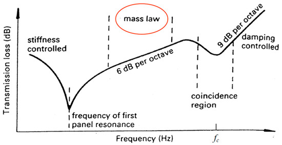 The graph model, above illustrated in Figure 19, is a general scheme of the transmission loss (TL) of material and presents the classical decreasing–increasing trend for low-frequency range up to the “linear” section regulated by the Law of the Mass. This law is essential to analytically define the TL respecting known parameters: