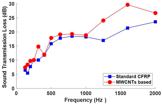 The sound insulation performance comparison was performed with respect to other literature data on similar panel configurations, due to the absence of a reference standard formulation. Koval [38], performed deep studies in 1980 on the transmission of airborne noise into an aircraft cabin: results demonstrated that the noise attenuation provided by a composite shell was not so advantageous as an aluminum wall, mainly due to the increased acoustic radiation efficiency of CFRP. The graph above (Figure 20) shows then a good performance of the nanotube based panel exhibiting already a higher STL at low frequencies, in correspondence with the normal mode participation region. Such behavior can be explained by the modal damping peculiarities of the panel as previously measured. It can be, in fact, assumed that the resonant path for STL is attributed to the coupling of acoustic waves to free bending waves in the panel. It usually dominates the overall response around and above the panel coincidence frequency, where the acoustic wavelength is about the same as the structural wavelength, making the panel radiation more effective. In this frequency range, it is the damping loss factor that primarily controls panel vibration response and consequently the sound transmitted through the panel, so the higher the loss factor, the higher the STL [39,40]. Moreover, an interesting value of the STL increasing up to 30 dB is then measured in the medium frequencies range, next to 1500 Hz.