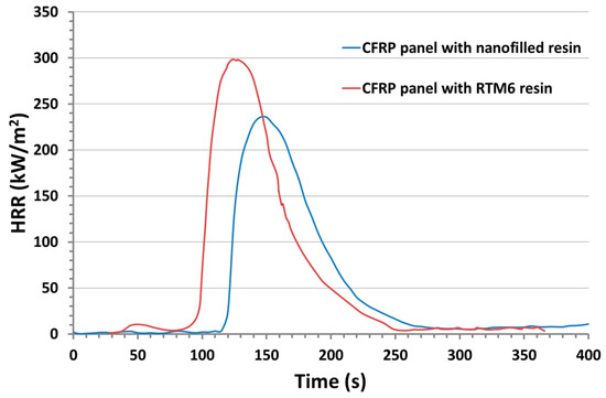 The flammability of the manufactured panels was analyzed with the cone calorimeter and the results were compared to those obtained on panels made in the same conditions but using a commercially available epoxy resin. The heat release rate for both composites made with the RTM6 and nanofilled resins is shown in Figure 21. Compared to the traditional RTM6 resin, the panel with the epoxy nanofilled resin exhibited a significant improvement in fire resistance properties. In fact, for the panel impregnated with the nanofilled resin with respect to the panel manufactured using the RTM6 resin, a delay in ignition time in addition to an increase in the thermal resistance of the material, which was manifested as a significant delay and reduction of the heat release rate (HRR) peak and in Table 1, showed some of the results obtained with the cone calorimeter test performed at the irradiance of 35 KW/m2. Compared to the panel obtained with the commercial epoxy RTM6, the peak of heat release rate (PHRR), the average HRR, and total heat release (THR) of the panel impregnated with the nanocomposite formulation decreased from 301 kW/m2 to 236 kW/m2 with a reduction of 21.4%, from 118 kW/m2 to 61 kW/m2 with a reduction of 48.6% and from 20 MJ/m2 to 17 MJ/m2 with a reduction of 15%, respectively. These data highlight that the flammability of the panel with the nanocomposite formulation is strongly reduced.