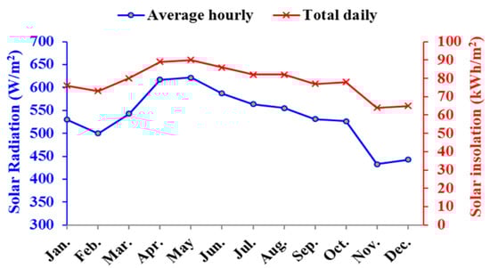The average ambient temperature and the average hourly and total solar radiation of Al-Ain for a typical day of each month are shown in