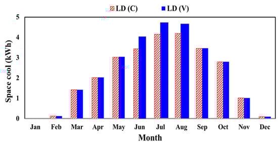 Based on the obtained weather data, the monthly energy demand required for cooling a residential house located in Al-Ain was obtained using constant (c) and variable (v) thermal conductivity of the dry low density polystyrene, and the result is shown in