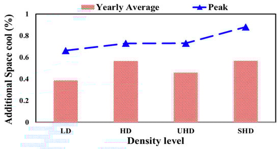 Figure 4, a low-density polystyrene applied in the wall section of the residential building in hot weather in Al-Ain, UAE resulted in the lowest yearly average of additional space cooling required (0.4%), while using a super-high-density polystyrene insulation showed the highest change in cooling demand at 0.5%. However, the abovementioned change for the dry polystyrene was not highly significant, since it was less than 1%.
