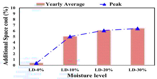 The total yearly average and peak additional energy demand for the air conditioning system to remove the heat from the space by percentage (additional space cool) were obtained for different levels of polystyrene density and different levels of moisture content, as shown in