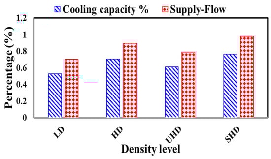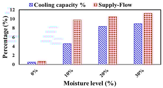 Figure 7. The yearly additional changes for cooling capacity and air flow at the 10% moisture level were 4.8% and 9.5%, respectively. Further increases of cooling capacity occurred as the moisture level increased to 20% of the polystyrene content, reaching 8.2%. The highest changes in cooling capacity and required air supplied were 8.9% and 11.2%, respectively, in the case of polystyrene with a 30% moisture content.