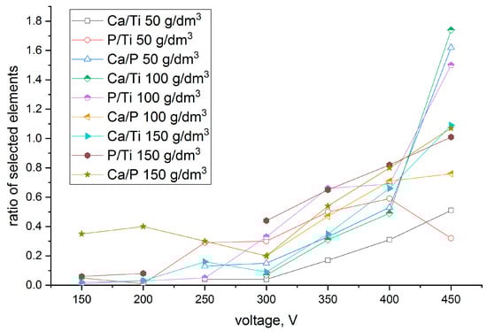 Biomaterials made by titanium alloys are widely used as long-term implants. The formation of bioactive coatings should be designed for specific material applications. For example, dental implants should be characterized by a low surface roughness compared with implants for hip replacement. In this study, we analyzed the possibility of incorporating hydroxyapatite particles into a porous oxide layer at various voltages and using an anodizing bath with a concentration of hydroxyapatite particles between 50–150 g/dm3. The chemical compositions given in Figure 1 are presented as a ratio of the bioactive compounds to the alloying elements and phosphorous and showed different levels of calcium and phosphorous incorporation. The EDX analysis showed the results as an average of the compound that was soluble in the anodizing bath and elements from the hydroxyapatite particles as well. The changes in the chemical composition of the coatings, in terms of the amounts of both calcium and phosphorous, were observed when the PEO process was carried out mainly in the solution with 150 g/dm3 of hydroxyapatite.