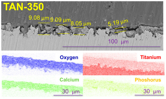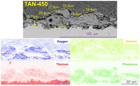 The surface morphology of the oxide layer strongly depended on the applied voltage during the PEO process. The characteristic microstructure of the oxide was observed when the voltage during the anodizing process was higher than 150 V. The surface of the TAN-200 sample is presented in Figure 2A. On the coating top, agglomeration of the hydroxyapatite particles was observed, and the agglomeration increased when the PEO process voltage increased to 250 V (TAN-250 sample, Figure 2B). The porous structure was clearly observed when the anodization voltage reached 300 V (TAN-300; Figure 2C), and the coating completely covered the titanium alloy surface. The pores were irregular with various shapes and sizes. The surface of the TAN-350 sample was also porous, and the pores were irregular with various shapes and sizes (Figure 2D). However, the structure of the coatings on the top of the layers was more reproducible than the surface observed for the TAN-300 sample. When the voltage increased to 400 V (Figure 2E), the coatings top melted, and the number of pores decreased in the top part of the layer. The pores were mostly round and were present throughout the top oxide layer. For the TAN-400 and TAN-450 samples, the agglomeration of incorporated hydroxyapatite particles was visible. However, the pores in the coating formed at 450 V (TAN-450; Figure 2F) were flakey and irregular. The significant changes in the surface morphology and chemical composition were observed for the titanium alloy samples anodized at 350 V and 450 V. Thus, for these surfaces, additional physicochemical analysis was performed. The limiting voltages applied during the PEO process also influenced the oxide layer thickness. The SEM cross sections and EDX mapping of the layers were obtained and they are shown in Figure 3 and Figure 4.